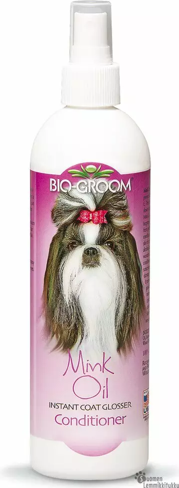 Minkkiöljyä ja E-vitamiinia sisältävä suihke, joka antaa turkille ennennäkemätöntä kiiltoa ja hehkua jo yhdellä käyttökerralla.