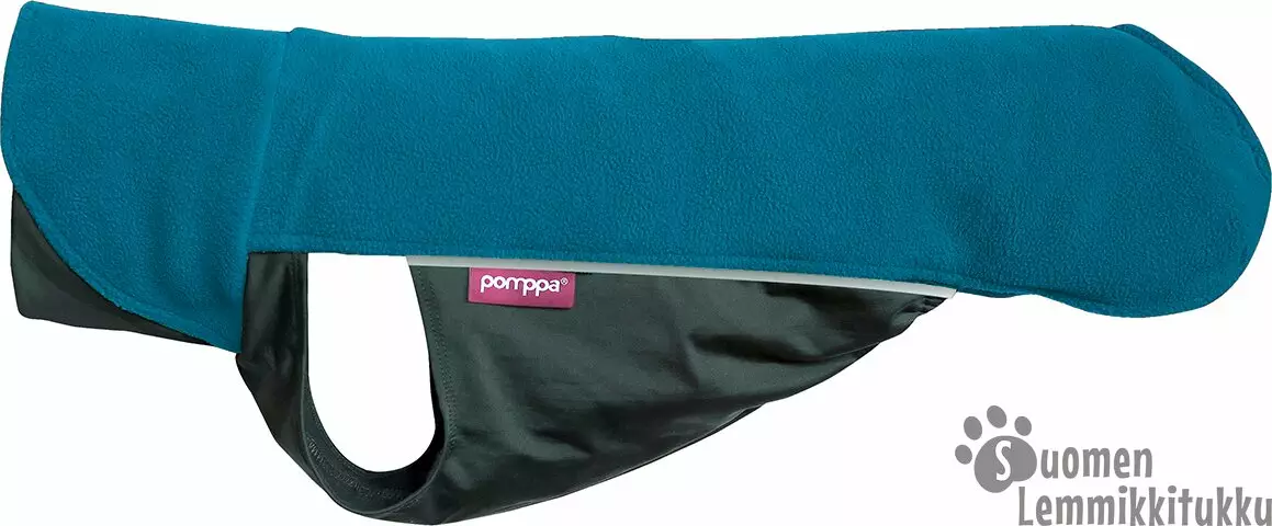 JumppaPomppa on koiran päälle pujotettava joustava lämpöpaita, joka on nopea pukea päälle. JumppaPomppa on mukava päällä eikä se rajoita koiran liikkumista. Selkäpuoli on antistaattista nyppyyntymätöntä plyysineulosta ja alaosa vettä hylkivää lämpötrikoota. Heijastimet sivusaumoissa takaavat, että koira näkyy pimeälläkin. Jumppaa voit käyttää lämpökerroksena joko Pomppa-takin alla tai sellaisenaan. Osalle koirista riittä talvella pelkkä JumppaPomppa, jotta koira pysyy lämpimänä.