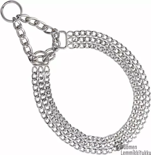 Kolmirivinen puolikiristävä ketjupanta, joka on valmistettu 2,0 mm vahvuisista litteiksi viilatuista teräslenkeistä. Kaulaimen leveys kaikissa koissa on 2cm. Soveltuu päivittäiseen käyttöön... Lue lisää