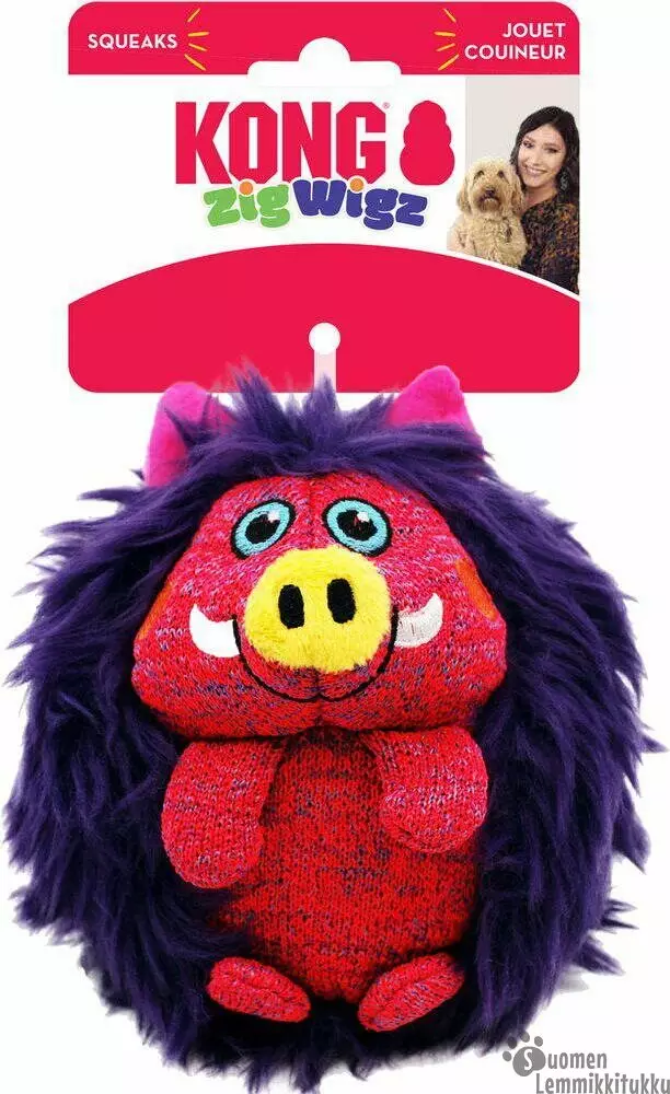 Kongin Zigwigz warthog on ihanan pyöreä ja pehmeä pallomainen pehmolelu koiralle. Lelu sopii hyvin käteen, joten sitä on helppo heittää koiralle. Koiran on helppo kantaa lelua suussa ja samalla vinguttaa sitä hampaissaan.