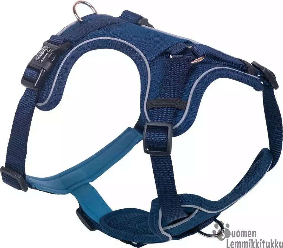 Valjaat on helppo pukea koiralle, sillä ne avautuvat molemmilta puolilta ja lukkojen kiinnitys on selän puolelle. Valjaiden kokoa saa säädettyä viidestä eri kohdasta optimaalisen istuvuuden turvaamiseksi.