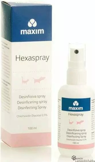 Maxin hexaspray on tarkoitettu Ihon pienten haavojen ja ruhjeiden desinfiointiin. Sopii sekä koirille että kissoille