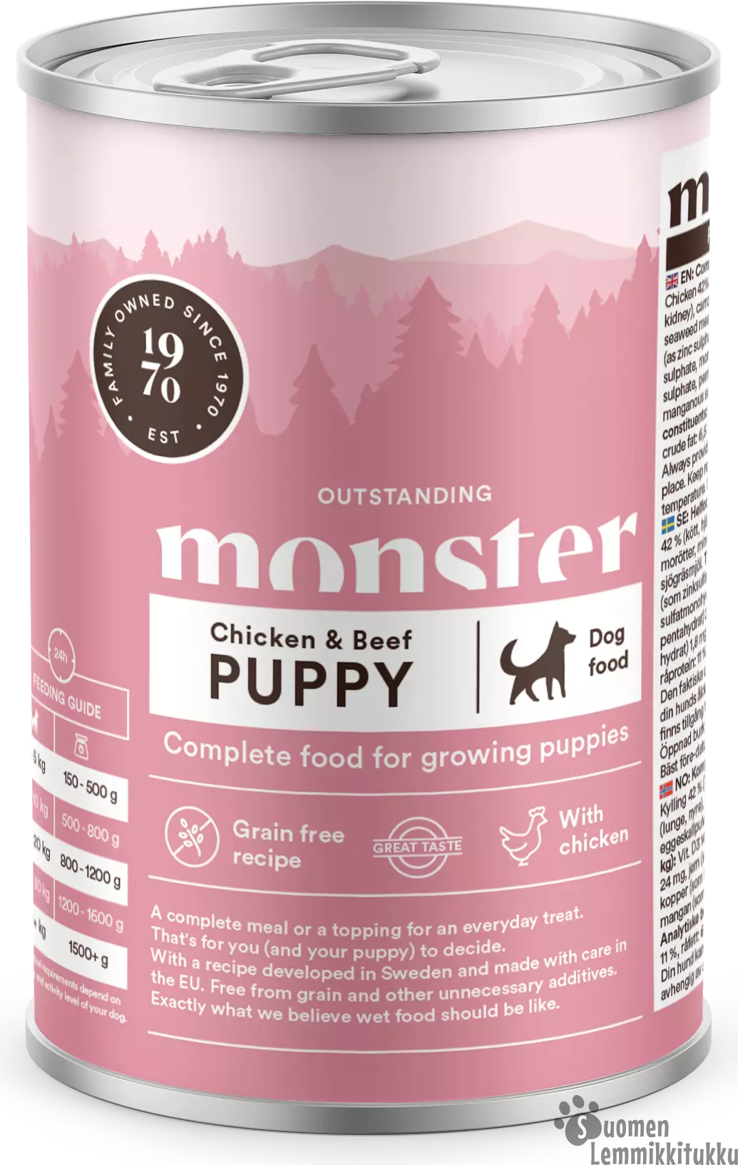 Monster Puppy Chicken on täydellinen ateria kasvavalle pennulle. Herkullinen kanaruoka sopii myös ruoka-annoksen lisukkeeksi kruunaamaan aterian. Ruotsissa suunniteltu ja tarkoin valitusta kanasta valmistettu ruoka sopii kaikille pennuille. Taatusti gluteenitonta, sokeritonta ja ilman tarpeettomia lisäaineita. Juuri sitä mitä mielestämme pennun märkäruuan tulisikin olla!