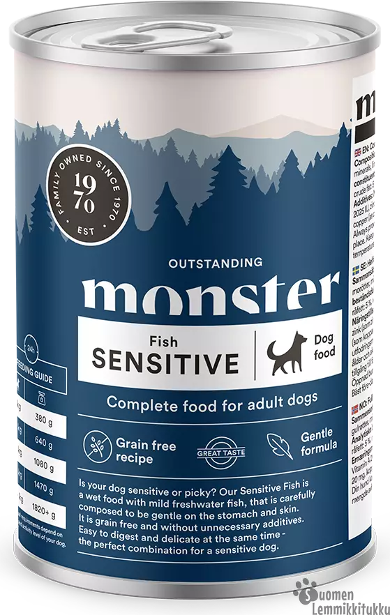 Monster sensitive Fish sisältää maistuvaa järvikalaa ja se on huolellisesti suunniteltu olemaan ystävällinen vatsalle ja iholle. Tuote on viljaton eikä sisällä tarpeettomia lisäaineita.