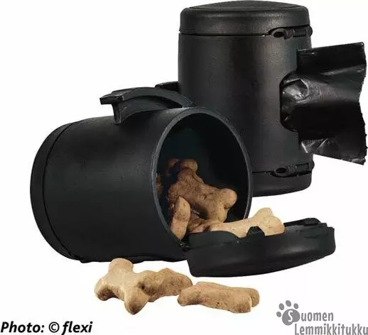 Flexi-kelataluttimeen kiinnitettävä kotelo esimerkiksi makupaloille ja kakkapusseille. Pakkauksessa mukana yksi rulla kakkapusseja (20pussia).
