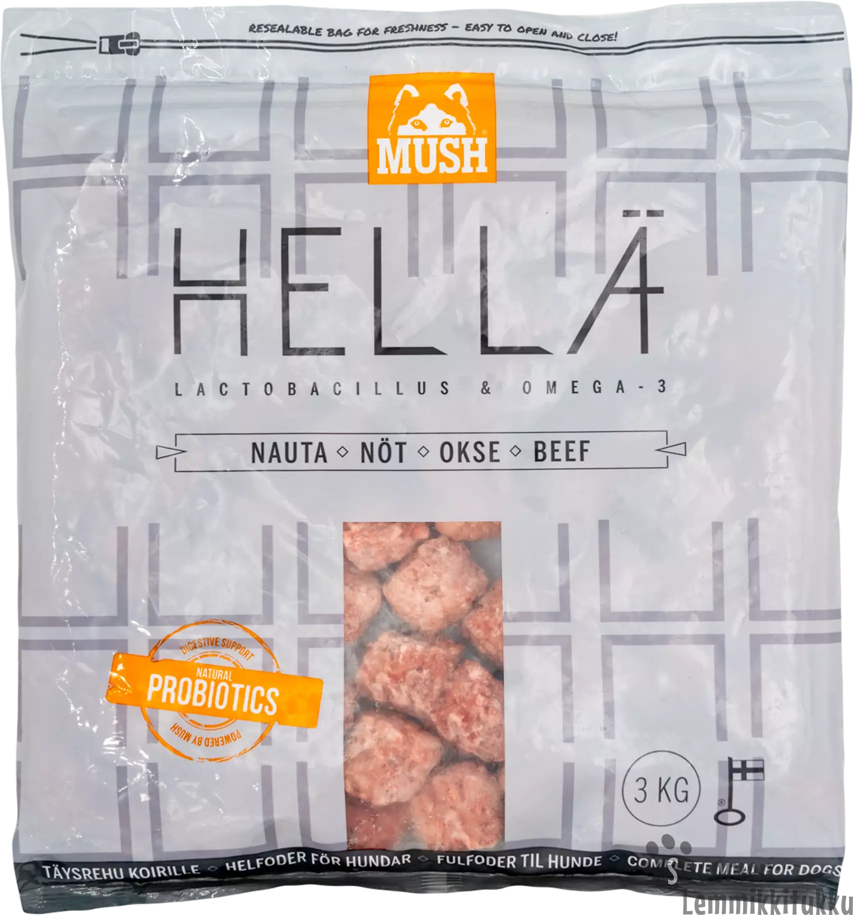 Hellä Nauta on pakattu 3kg pusseihin ja tuote on muotoiltu Vaisto®-täysravintojen tyyliin, helposti annosteltaviksi lihapulliksi.