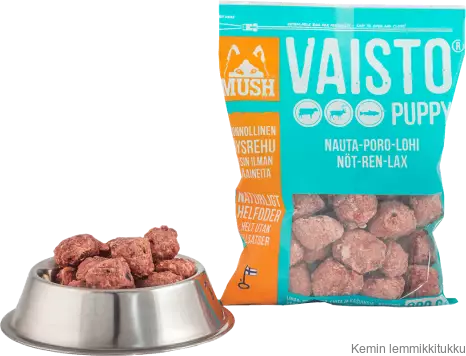 MUSH Vaisto® Nauta-poro-lohi PUPPY jäänsininen on koiran täysravinto. MUSH Vaisto® PUPPY jäänsininen on suunniteltu koiranpennuille jotka kasvavat vielä korkeudessa. Luumäärä 10 %, maksa 5 %. Aloita tällä tuotteella, jos haluat opettaa koirasi syömään riistaa.