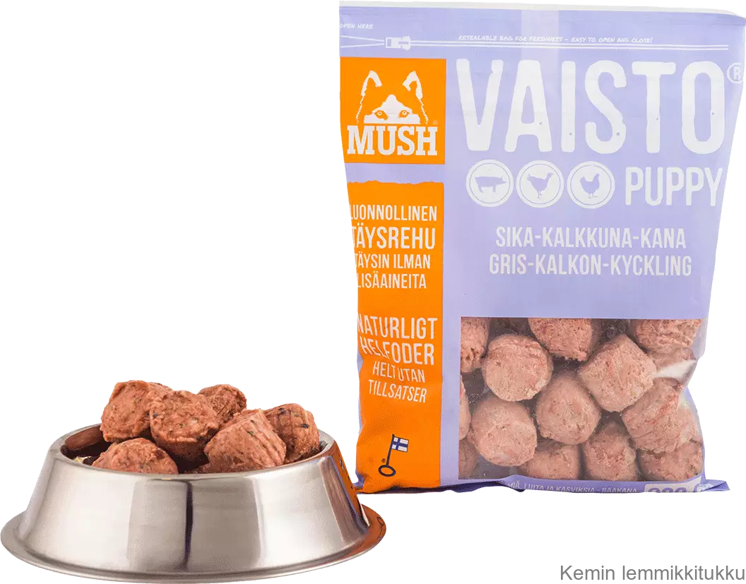 MUSH Vaisto® Sika-kalkkuna-kana PUPPY vaaleanliila on koiran täysravinto. MUSH Vaisto® PUPPY vaaleanliila on suunniteltu aktiivisille koiranpennuille jotka kasvavat vielä korkeutta. Puppy vaalenliila on erinomainen valinta pennuille, jotka tarvitsevat hieman enemmän energiaa ruokavaliostaan.