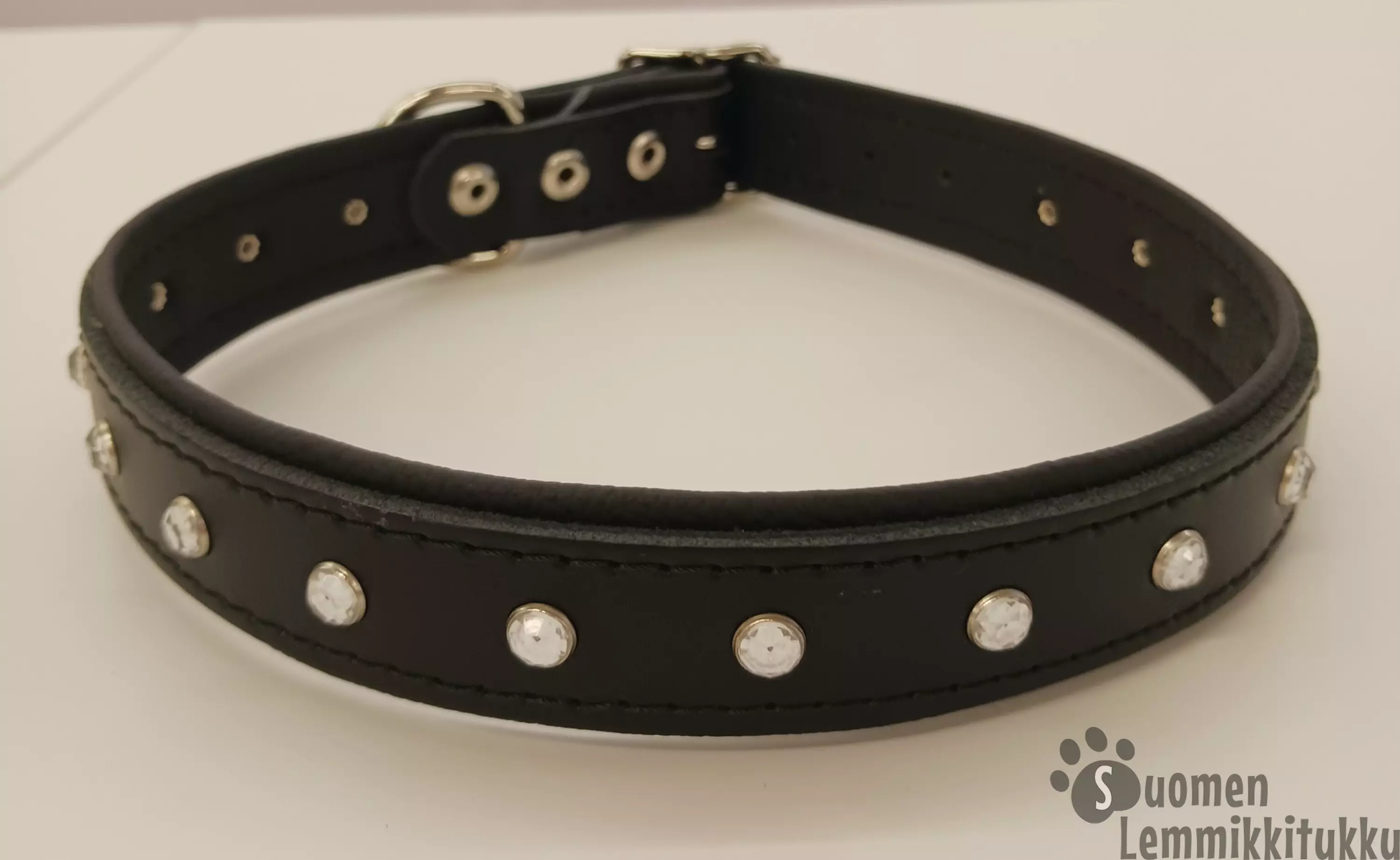 Laadukas peruspanta pehmeätä nahkaa, jossa näyttävyyttä tuovat strassikoristeet. Panta on laadukasta suomalaista käsityötä NahkaNastalta.
