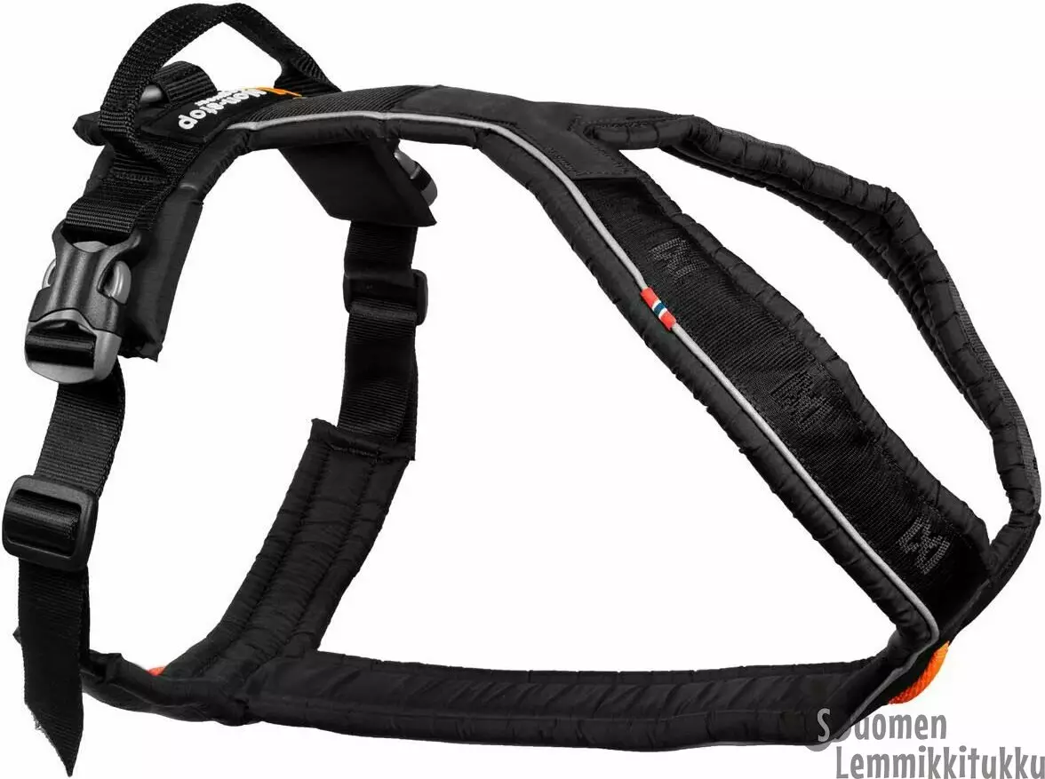 3M? heijastimet takaavat näkyvyyden useimmista suunnista pimeällä. Valjaiden sisäpuoli valmistetaan aina siten, että kaikki materiaalit menevät päällekkäin ilman kovia reunoja. Jokaisen sauman sileä puoli on koiran vartaloa vasten, jolloin varmistetaan, ettei valjas hankaa koiraa. Valjas on kestävää nylon kangasta ja siinä käytetty pehmuste on suljettua solurakennetta, joka ei ime vettä. Line harness grip valjaassa on Hypalon vahvisteet kohdissa, joihin kohdistuu suurin rasitus.