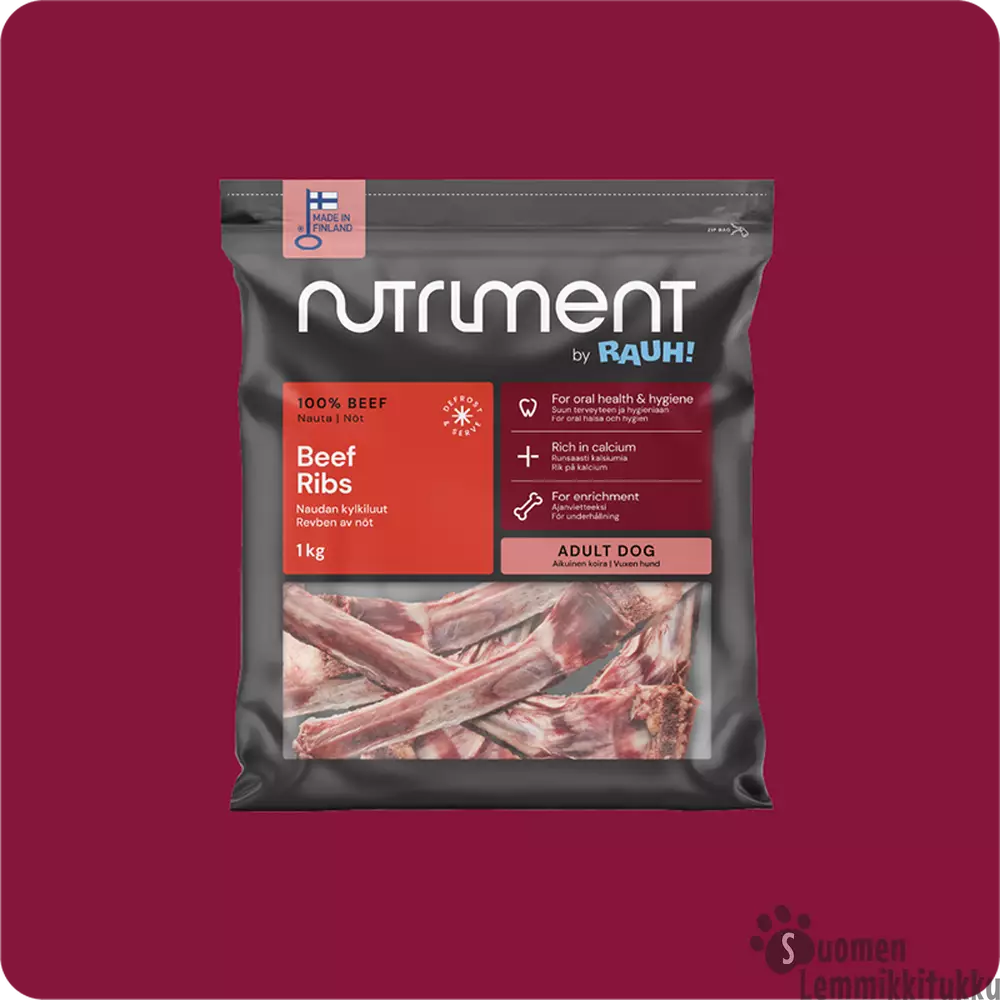 Nutriment by RAUH raakapakasteet on puhtaista raaka-aineista valmistettua raakaruokaa ilman säilöntäaineita. Kylkiluut tarjoillaan koiralle raakana osana tasapainotettua raakaruokavaliota.