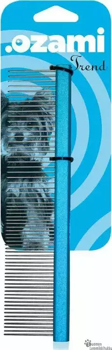 Metallinen pitkäpiikkinen kampa viimeistelyyn. Metallinen kampa on lujaa tekoa mutta kuitenkin kevyt käyttää. Tämä kampa sopii pitkälle ja tiheälle turkille. Piikkien päät on pyöristetty, jotta kampaaminen ei raapisi koiran herkkää ihoa. Kamman toisessa päässä on tiheämmät piikit