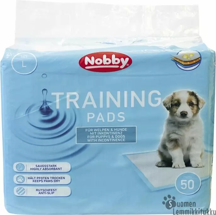 Erittäin imukykyinen, tarrakiinnitteinen suoja-alusta koiranpentujen sisäsiisteysharjoitteluun.