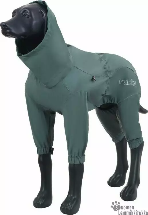 Joustava materiaali kestää hyvin käyttöä ja tuntuu miellyttävältä päällä. Lahkeensuiden tarrakiinnitysten ansiosta haalari sopii kaiken kokoisille tassuille ja pysyy tiiviinä. Säädettävä vyötärö ja säädettävä pääntie viimeistelevät istuvuuden ja maksimoivat suojan. Korkea, säädettävä kaulus suojaa kaulaa ja sen voi nostaa tuulensuojaksi koiran korville.