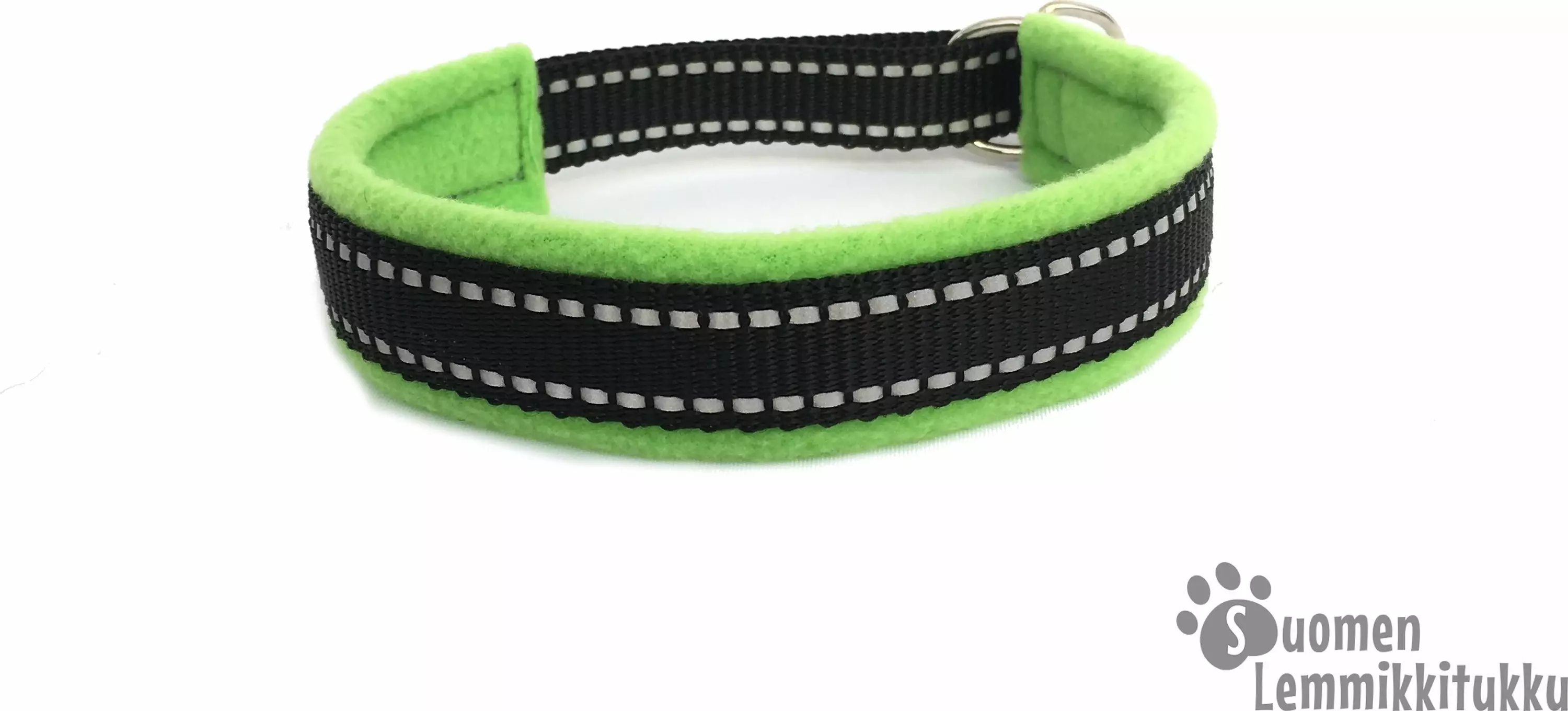 Vijuen kotimaista käsityötä puolikiristävä pehmeä panta. Pannassa on fleecepehmuste ja heijastinnauha. Panta on kevyt ja suhteellisen kapea, joten se sopii myös pienemmälle koiralle.