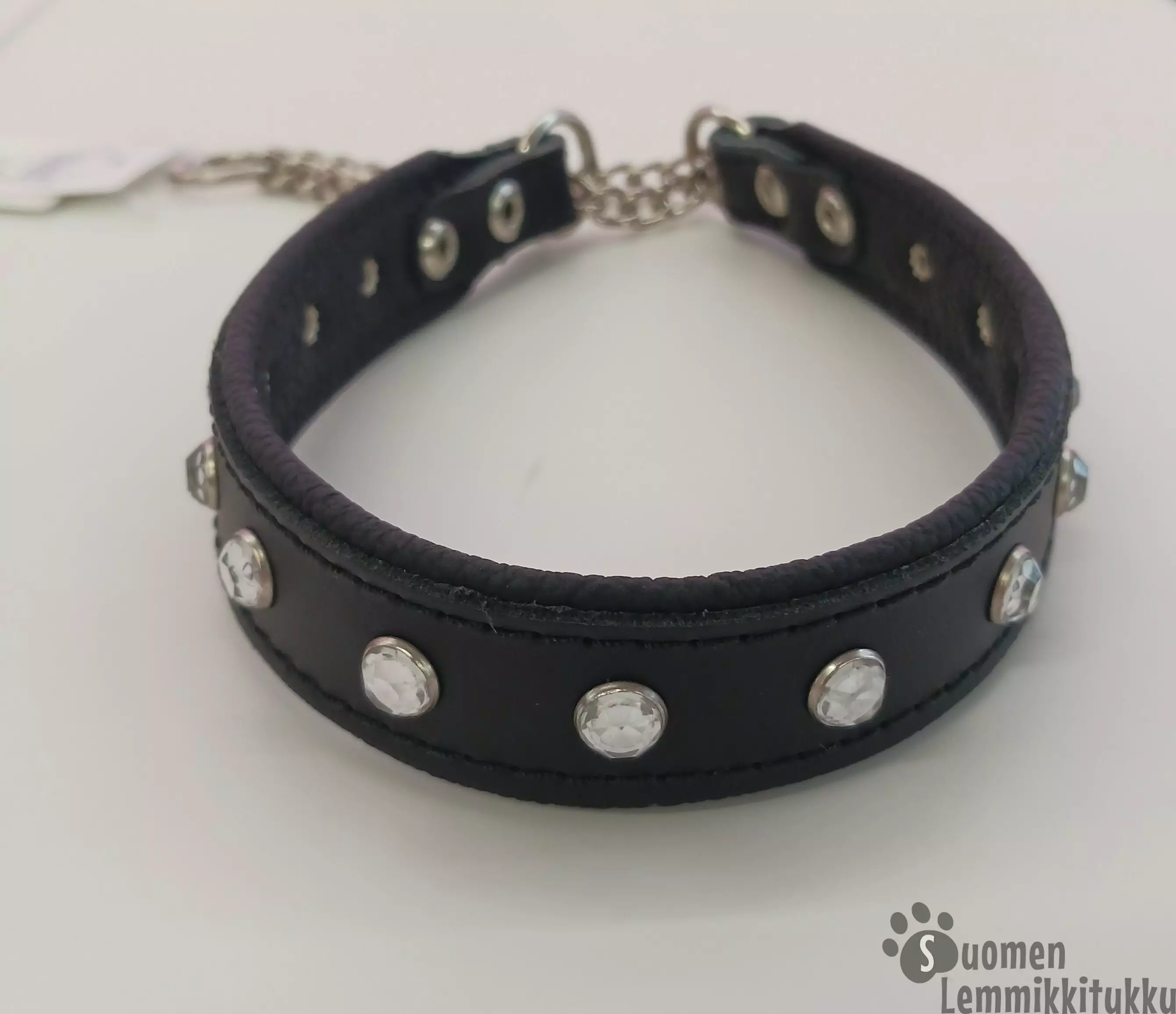 Puolikiristävä nahkapanta koiralle strasseilla, musta