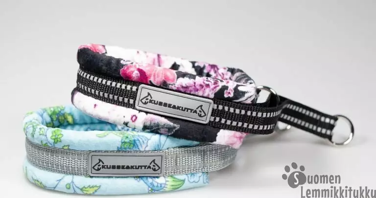 Kusse & Kutta puolikiristävä panta on mukava käytössä: sisäpuoli on ihanan pehmeää polyesterikarvaa, joka ei hierrä kaulaa eikä katko karvaa. Sisällä on pehmeä vaahtomuovitäyte. Ulkopuolella on laadukas ja standardoitu heijastinnauha, joka lisää näkyvyyttä hämärän ja pimeän aikaan. Metalliset renkaat ovat hitsattuja ja kestävät hyvin kovaakin vetoa.