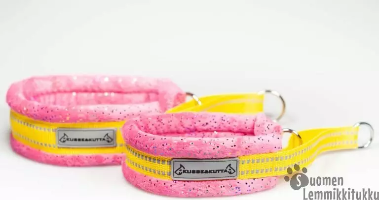 Kusse & Kutta puolikiristävä panta on mukava käytössä: sisäpuoli on ihanan pehmeää polyesterikarvaa, joka ei hierrä kaulaa eikä katko karvaa. Sisällä on pehmeä vaahtomuovitäyte. Ulkopuolella on laadukas ja standardoitu heijastinnauha, joka lisää näkyvyyttä hämärän ja pimeän aikaan. Metalliset renkaat ovat hitsattuja ja kestävät hyvin kovaakin vetoa.