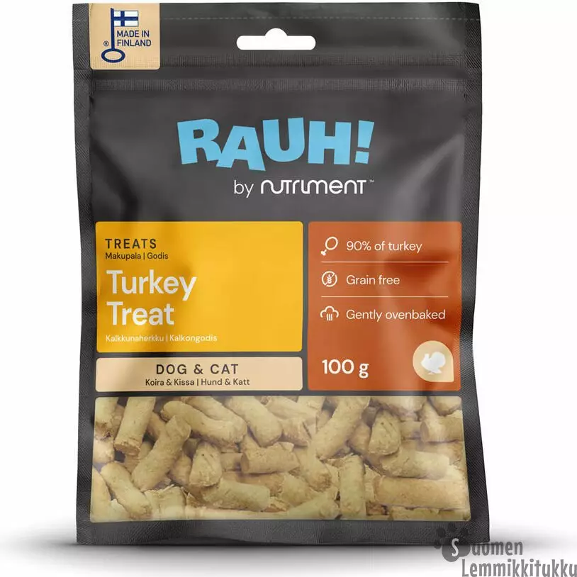 Rauhin herkullinen kalkkunaherkku sopii sekä koirille että kissoille. Lihaisa herkku saa nirsoimmankin karvatassun kiinnostumaan sillä pussilliseen kalkkunaherkkua on käytetty n.220g tuoretta lihaa.