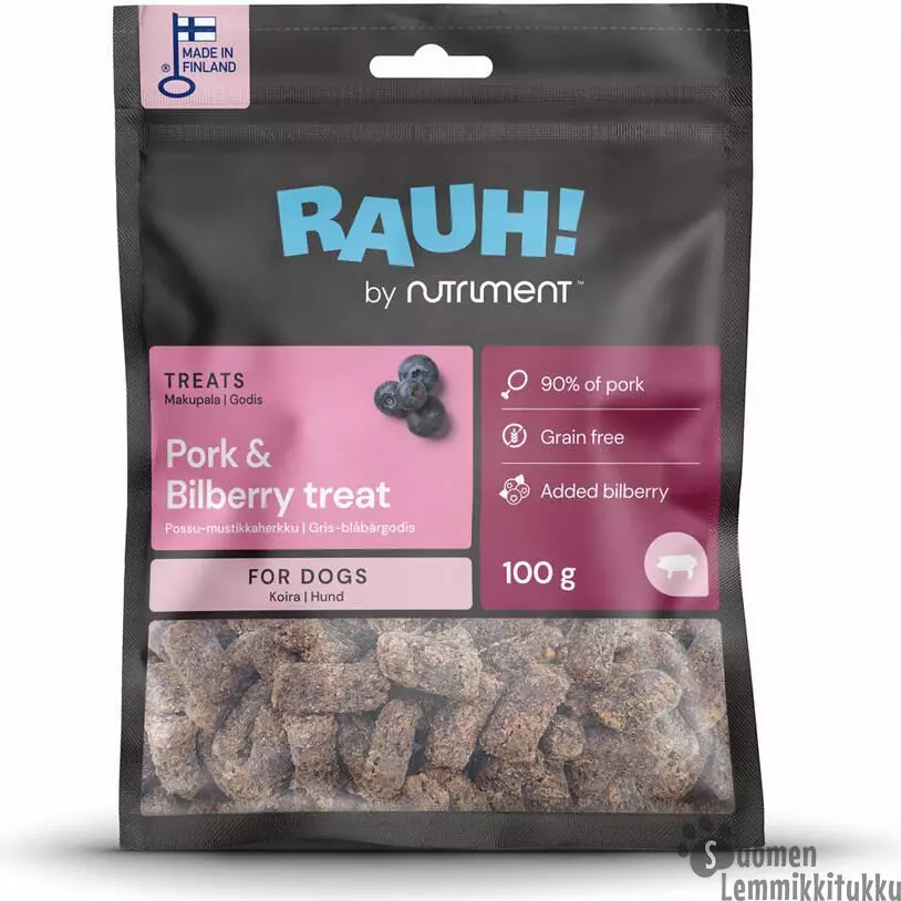 Rauh by Nutrimentin possu-mustikkaherkku on valmistettu Suomessa suomalaisesta possusta. Tässä herkullisessa makupalassa on possua 90% mikä takaa maistuvuuden.
