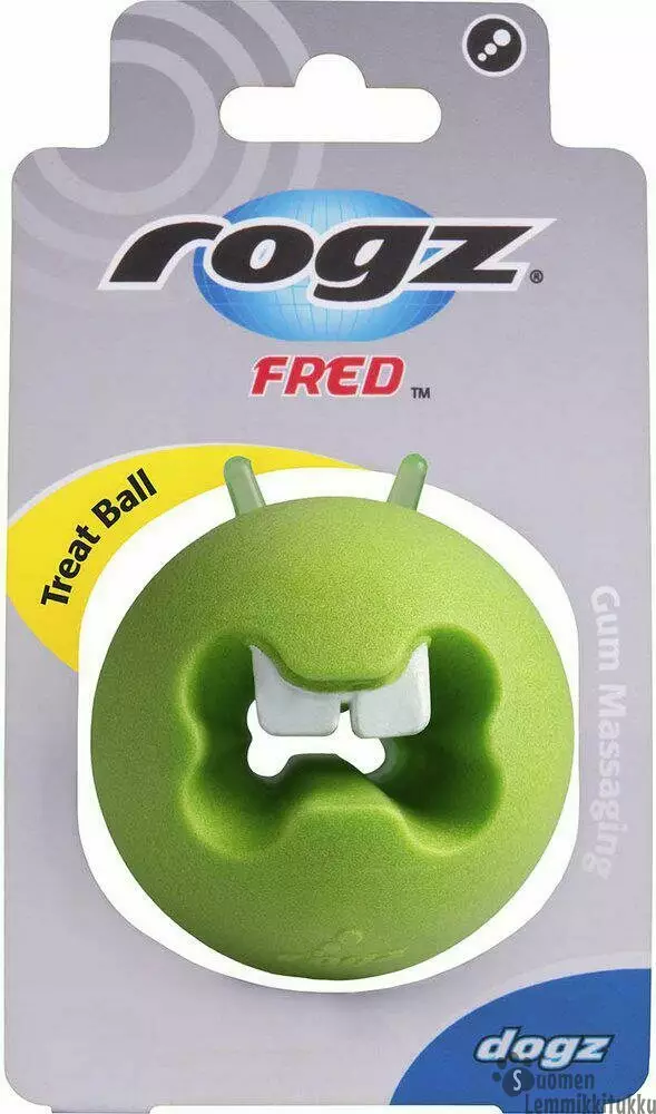 Rogzin Fred namipallossa on luonnetta! Pallossa on sekä suurempi että pienempi aukko nameille, joten siihen sopivat sekä pienemmät että isommat namit. Pallon piikknen puoli hieroo ja puhdistaa hampaita ja ikeniä samalla kun koirasi pitää hauskaa. J asopiipa Fred myös ihan perinteisiin palloleikkihinkin.