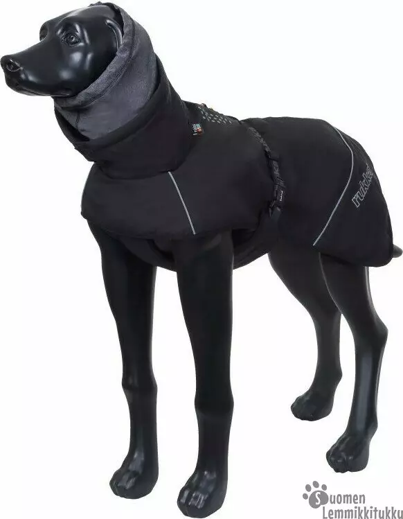 Vedenpitävä materiaali kestää hyvin käyttöä ja tuntuu miellyttävältä päällä. Säädettävän kuminauhavyön avulla takki on helppo säätää sopivan kokoiseksi ja se istuu hyvin eri rotuisten ja kokoisten koirien päälle. Takissa on bonuksena irrotettava trikootuubikaulus, jonka voi halutessaan kääntää taakse. Pehmeän trikootuubin sisälle saa myös tarvittaessa suojattua koiran korvat. Takajalkojen kuminauhalenkit varmistavat, että takki pysyy tiiviisti koirasi päällä kovassakin vauhdissa. Näkyvien heijastimien avulla koirasi erottuu tehokkaasti myös pimeällä. Takissa on useita heijastavia tereitä ja printtejä