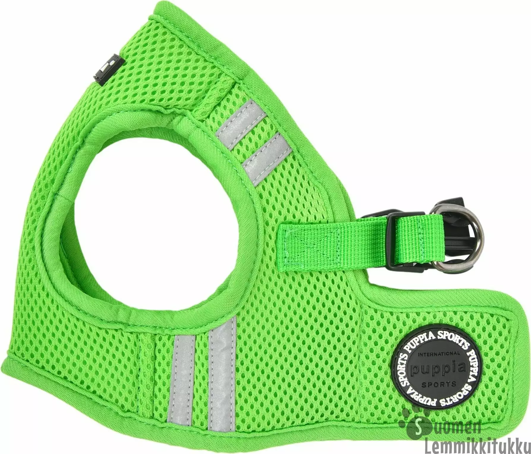 Puppian takkivaljaat ovat perintesiä vajaita tukevammat ja niissä on kiinnitys tarralla selän päältä. Valjaat on todella helppo pukea päälle: vedä tassut valjaiden tassuaukkojen läpi ja kiinnitä tarralla selän päältä. Selän päällä on lisäksi vielä erikseen pistolukkokiinnitys sekä metalliset renkaat talutinta varten. Valajisden molemmilla sivuille on heijastinraidat.