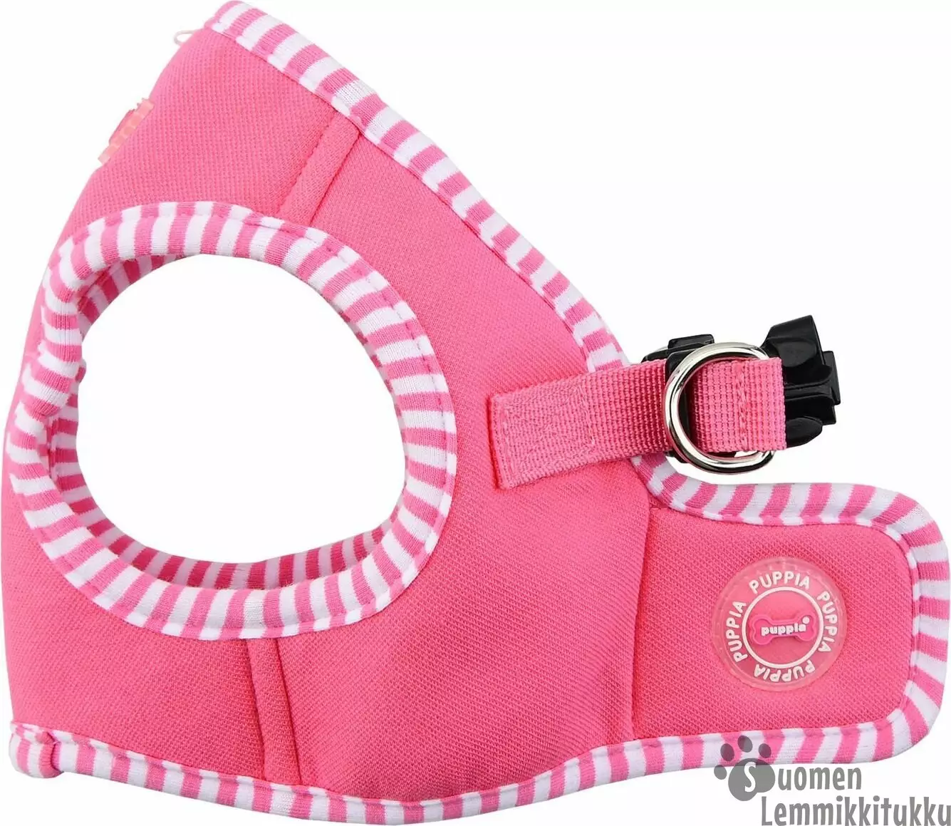 Puppian takkivaljaat ovat perinteisiä valjaita tukevammat ja niissä on kiinnitys tarralla selän päältä. Valjaat on todella helppo pukea päälle: vedä tassut valjaiden tassuaukkojen läpi ja kiinnitä tarralla selän päältä. Selän päällä on lisäksi vielä erikseen pistolukkokiinnitys sekä metalliset renkaat talutinta varten.