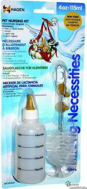 Tuttipullo koiran- tai kissanpennun lisäruokintaa varten pentuvaiheessa. Erittäin hyödyllinen apuväline, varsinkin jos pennun luonnollinen emo ei ole ruokkimassa pentua. Sarja sisältää tuttipullon + 3 tuttia ja puhdistusharjan. Pullon tilavuus 115 ml.